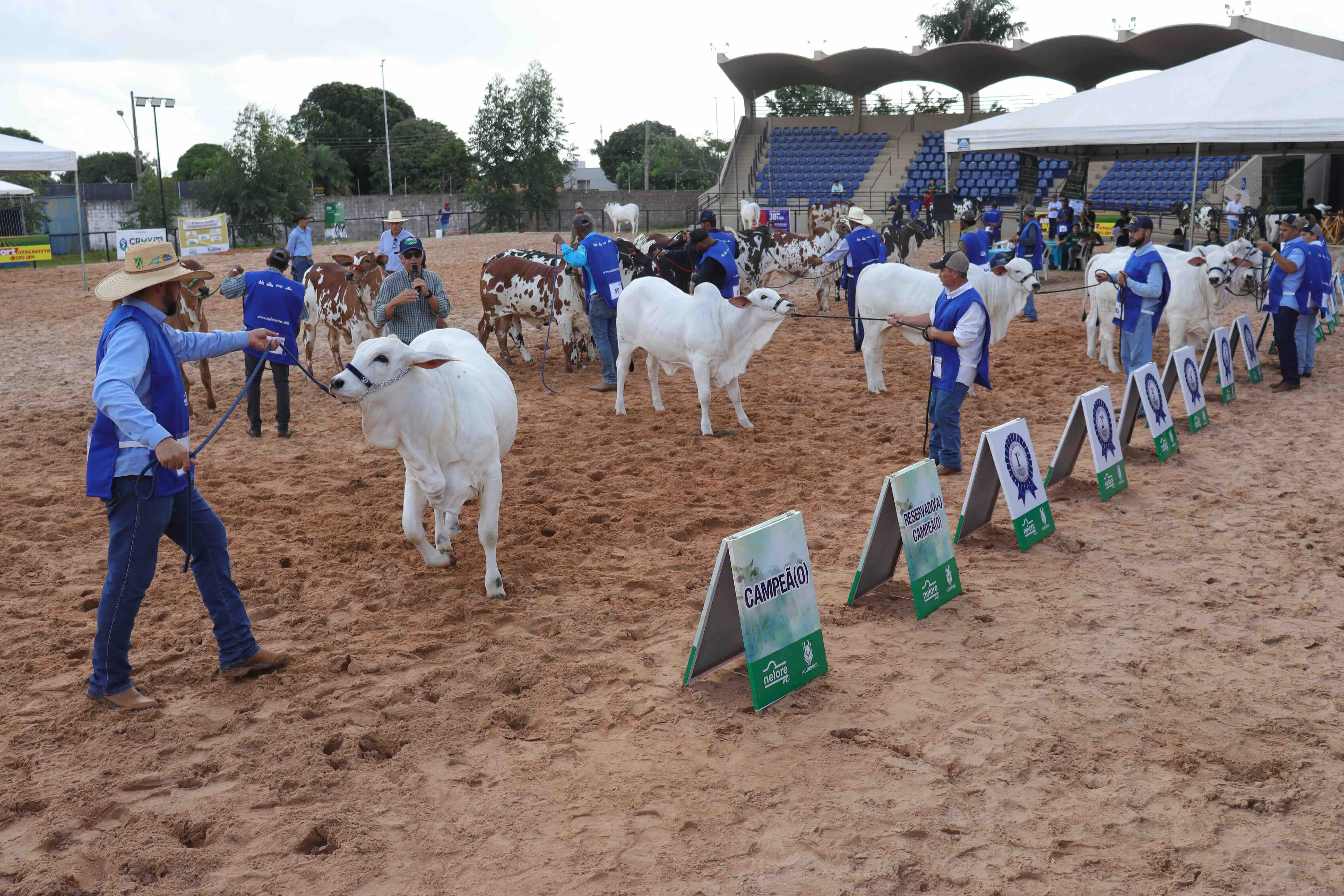 Pista de julgamento da Expogrande 2025, com nelore mocho e pelagem (Foto: Divulgação | Acrissul)