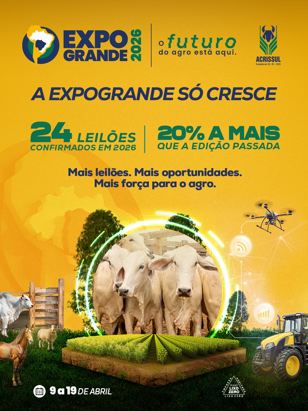 A próxima edição da Expogrande 2026 já mobiliza o setor produtivo de Mato Grosso do Sul. Promovida pela Acrissul, a feira será realizada de 09 a 19 de abril, no Parque de Exposições Laucídio Coelho, em Campo Grande, reunindo produtores, empresas, instituições financeiras e milhares de visitantes.