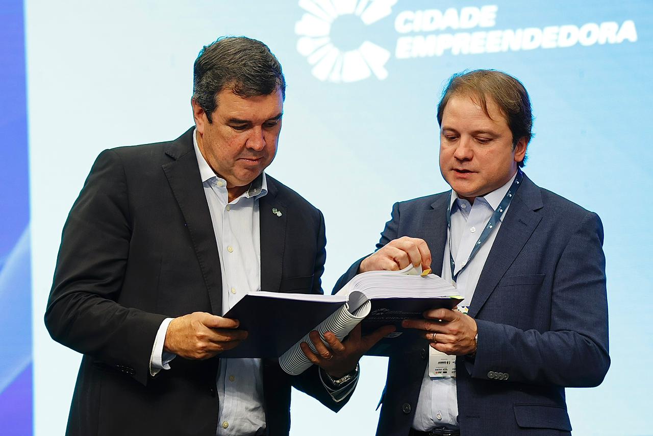 Diretor-superintendente do Sebrae/MS, Claudio Mendonça, entregou ao governador de MS, Eduardo Riedel, um compilado com os os acordos municipais de gestão elaborados pelos municípios que integram o Cidade Empreendedora, por meio do programa.