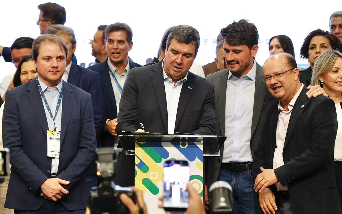 Acordo Municipal de Gestão foi assinado pelo diretor-superintendente do Sebrae/MS, Claudio Mendonça; governador de MS, Eduardo Riedel; e, representando os municípios participantes do programa Cidade Empreendedora o presidente da Assomasul e prefeito de Itaquiraí, Thalles Tomazelli.