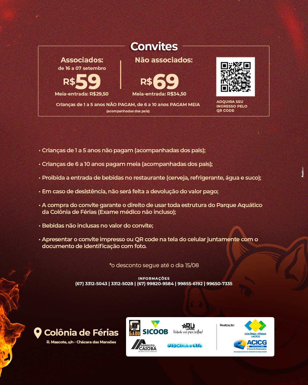 Mais informações e reservas podem ser feitas pelos telefones (67) 3312-5043 e (67) 99820-9584. Acesse o site (https://acicg.com.br/) ou as redes sociais (https://www.instagram.com/acicgms/).
