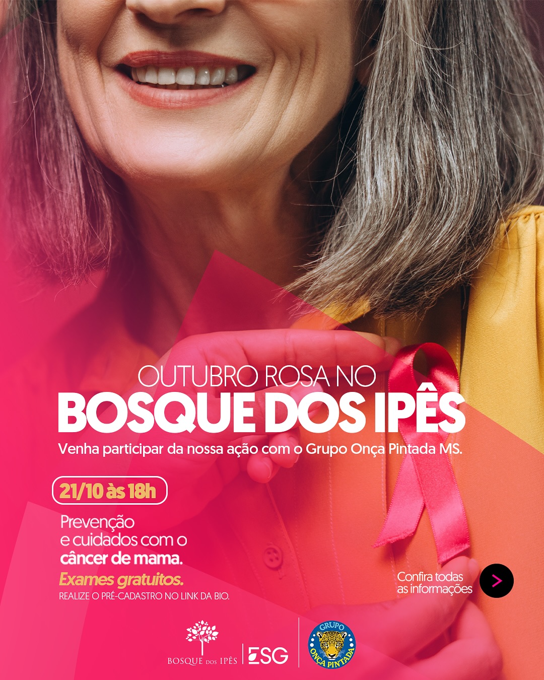 O Shopping Bosque dos Ipês será ponto de conscientização e cuidado neste 21 de outubro, ao receber uma ação especial do Outubro Rosa em parceria com o Grupo Onça Pintada, referência em prevenção ao câncer de mama em Mato Grosso do Sul. A iniciativa oferece exames clínicos e ultrassonografias das mamas gratuitos para mulheres da comunidade, reforçando a importância do diagnóstico precoce na luta contra a doença.