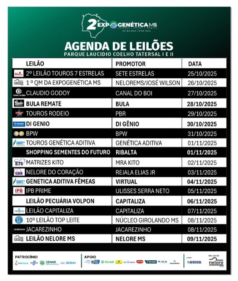 O calendário segue com Shopping Sementes do Futuro – Ribalta (01/11), Matrizes Kito (02/11), Nelore do Coração (03/11), Genética Aditiva Fêmeas (04/11), IPB Prime (05/11), Leilão Pecuária Volpon (06/11), Capitaliza (07/11), e o tradicional Leilão Nelore MS (09/11), encerrando a programação com a marca da casa.