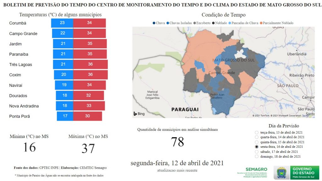 Será mais um dia com grande amplitude térmica em Mato Grosso do Sul. A mínima esperada para o Estado é de 16°C e a máxima pode chegar aos 37°C.