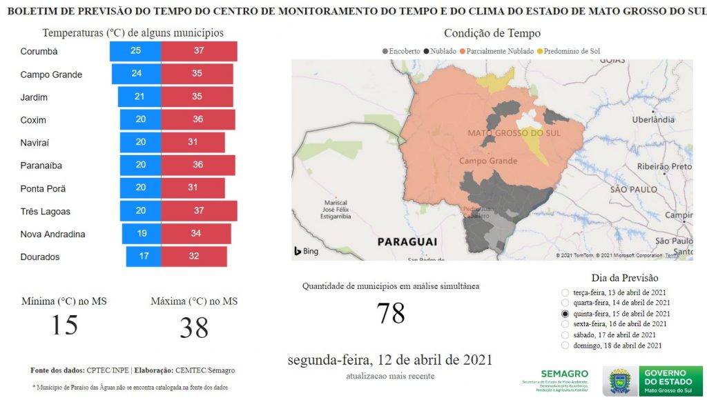 Ventos de intensidade fraca são esperados para todo Estado. As temperaturas em Mato Grosso do Sul podem registrar mínima de 15°C e máxima de 38°C.