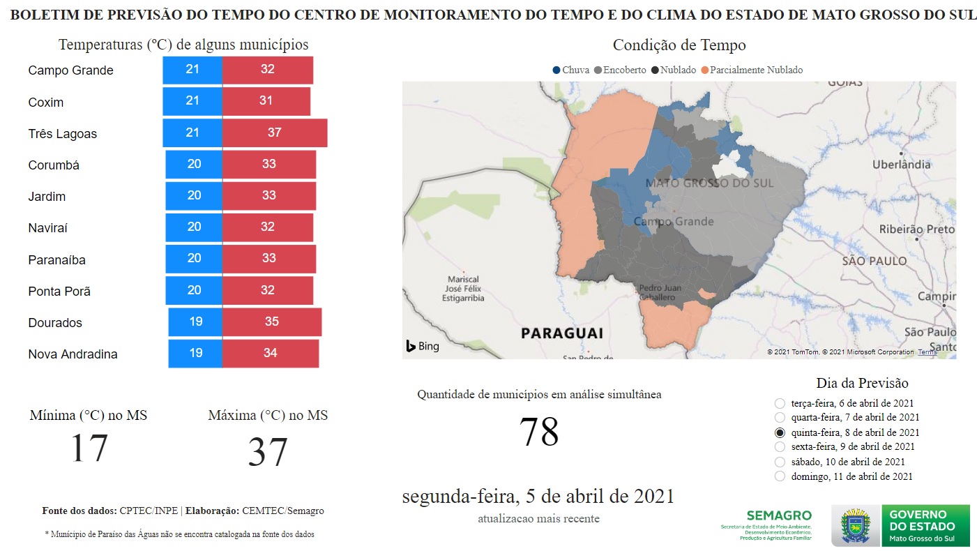 As temperaturas voltam a subir nesta quinta, com a mínima estimada em 17°C e a máxima em 37°C para Mato Grosso do Sul. Na capital a variação está estimada em 21°C a 32°C.