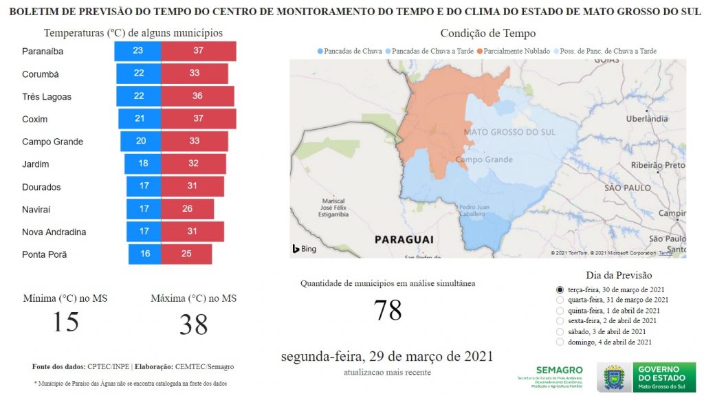 As condições estimadas pelo Centro de Monitoramento do Tempo e do Clima (Cemtec) para esta terça-feira (30) em Mato Grosso do Sul são de céu parcialmente nublado a nublado. Existe a possibilidade de pancadas de chuvas isoladas e de fraca intensidade no Estado.