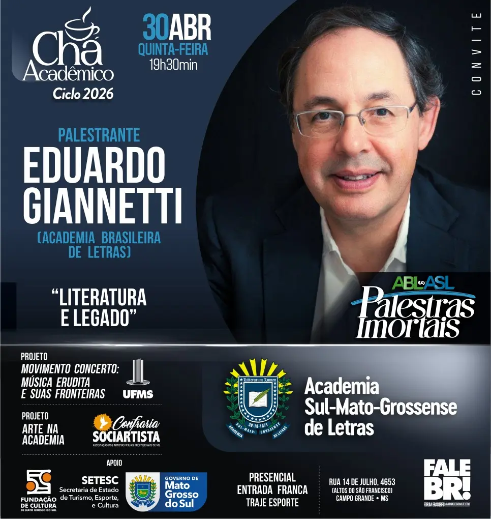 A Academia Sul-Mato-Grossense de Letras realiza seu primeiro Chá Acadêmico do ano na ASL nesta quinta-feira, dia 30, com o imortal Eduardo Giannetti, da Academia Brasileira de Letras, abrindo o ciclo 2026 do projeto “ABL na ASL: Palestras Imortais” ─ que é desenvolvido em parceria entre a ASL e o Governo do Estado, por meio da Setesc – Secretaria de Turismo, Esporte e Cultura – e da Fundação de Cultura de Mato Grosso do Sul (FCMS). O evento será às 19h30min, presencial e com entrada franca no auditório da ASL, na rua 14 de Julho, 4653, em Campo Grande.