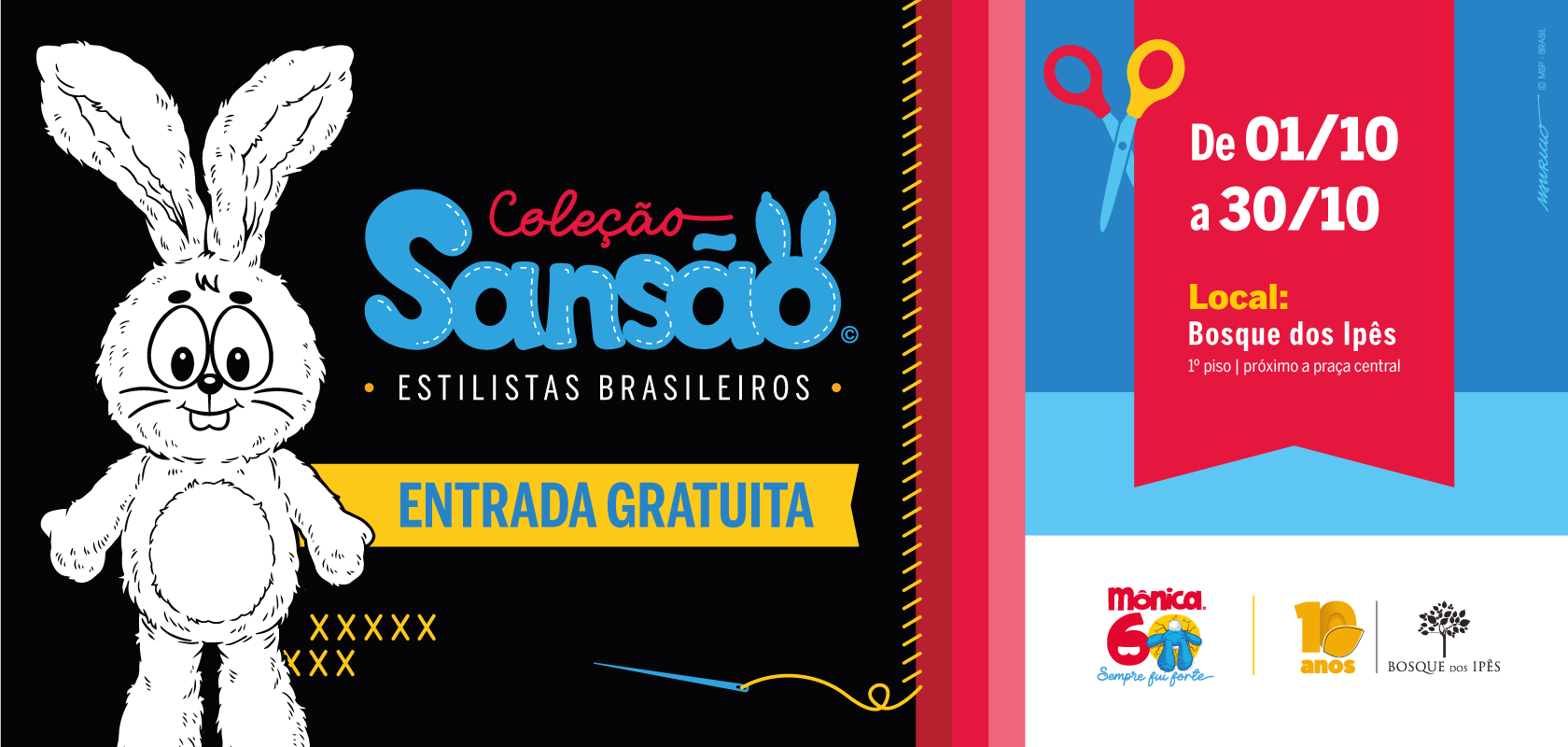 O Shopping Bosque dos Ipês anuncia a exposição “Sansão – Estilistas Brasileiros”, em parceria com a Mauricio de Sousa Produções (MSP), entre 01 e 30 de outubro. Para comemorar os 60 anos da personagem Mônica, foram convidados estilistas brasileiros para uma intervenção artística no famoso coelho da personagem, o Sansão. As obras, que ganham outros materiais e cores além da tradicional pelúcia azul, podem ser conferidas gratuitamente pelos fãs e por visitantes do complexo no 1º piso, ao lado da Praça Central.