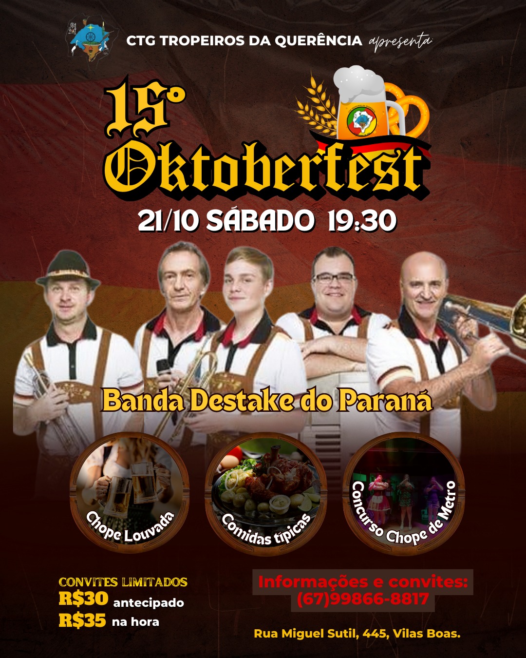 O CTG Tropeiros da Querência vai celebrar a Oktoberfest no próximo sábado, dia 21 com chope, comidas típicas e concurso do chope por metro.