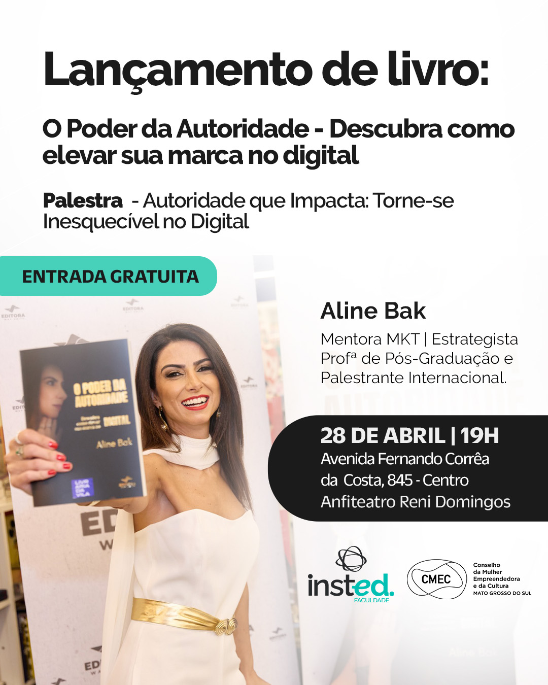 A mentora e estrategista em marketing digital, Aline Bak, estará em Campo Grande no próximo dia 28 de abril, para uma palestra exclusiva e o lançamento de seu mais novo livro “O Poder da Autoridade: Descubra Como Elevar Sua Marca no Digital”. O evento acontecerá no auditório da Faculdade Insted, a partir das 19 horas, e promete reunir empresários, empreendedores, profissionais da comunicação e interessados em se destacar no mundo digital.