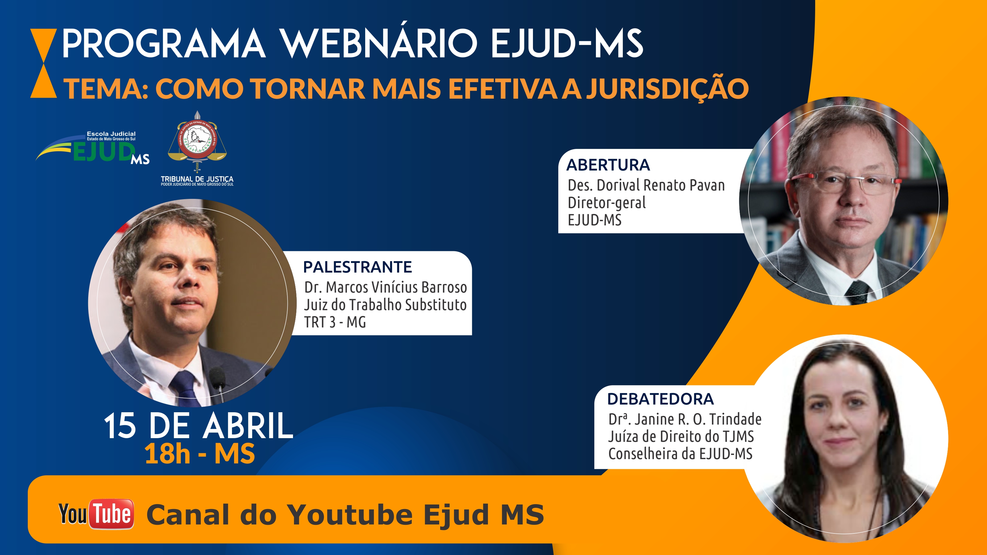 A Escola Judicial do Estado de Mato Grosso do Sul (Ejud-MS), por intermédio do Diretor-Geral, Des. Dorival Renato Pavan, convida magistrados(as), servidores(as) e colaboradores(as) do Poder Judiciário do Estado de Mato Grosso do Sul e toda comunidade jurídica para participarem do Programa Webnário Ejud-MS: “Como tornar mais efetiva a jurisdição” que acontece hoje, dia 15 de abril de 2021, a partir das 18 horas, horário de Mato Grosso do Sul.
