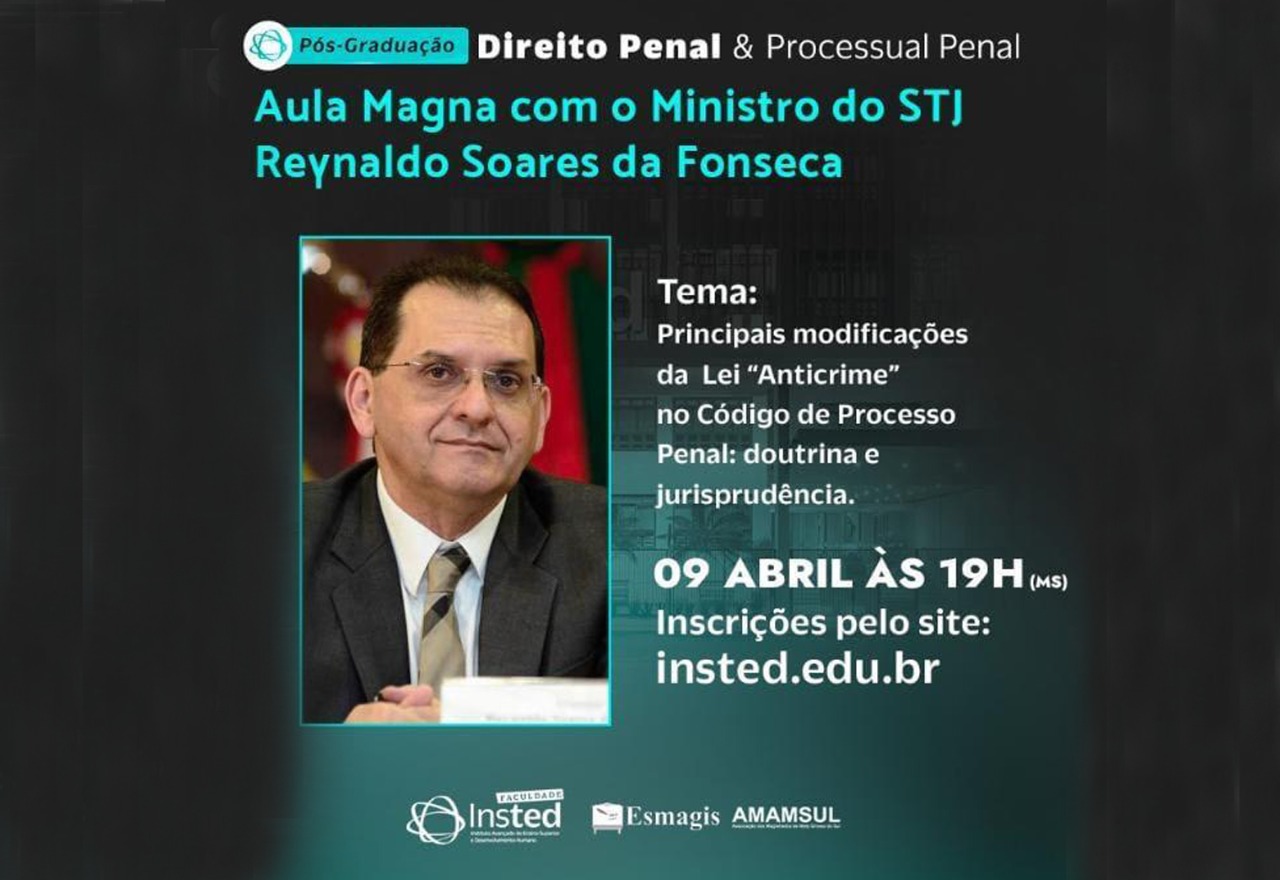 Com o tema “Principais modificações da Lei Anticrime no Código de Processo Penal: doutrina e jurisprudência”, será realizada nesta sexta-feira (9), às 19 horas (MS), a aula magna do curso de pós-graduação em Direito Penal e Processual Penal da Faculdade Insted com o ministro Reynaldo Soares da Fonseca, do Superior Tribunal de Justiça. Conhecida também como pacote anticrime, a nova legislação, que completou um ano em vigor em janeiro de 2021, alterou dispositivos do Código Penal, do Código de Processo Penal e da Lei de Execuções Penais.