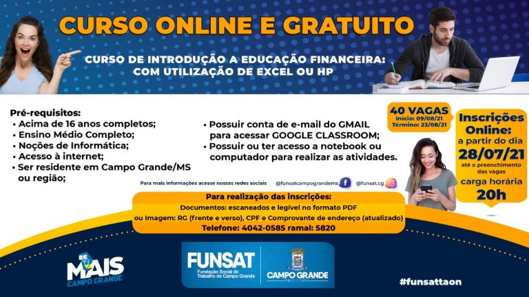Nesta quarta-feira (28), A Fundação Social do Trabalho (Funsat), está com inscrições abertas para o curso online e gratuito de Introdução a Educação Financeira: com utilização de Excel ou HP, com carga horária total de 20 (vinte) horas. O curso permitirá ao aluno ter autonomia de organizar seus horários de estudo. São 40 vagas, as inscrições poderão ser feitas online através dos links abaixo.