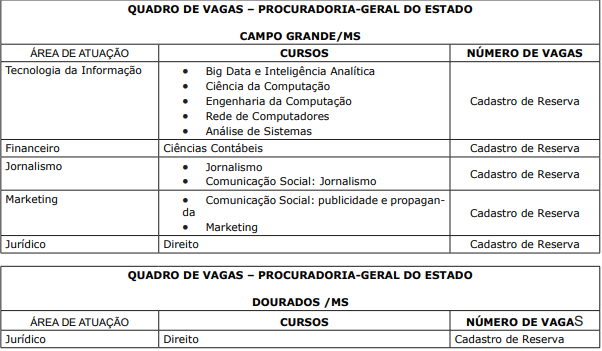 A instituição oferece oportunidade para os universitários nas áreas de Tecnologia da Informação, Financeira, Jornalismo, Marketing e Jurídica, todas em Campo Grande. Já para o município de Dourados somente para a área Jurídica. O edital completo está publicado na edição nº 10.453 do Diário Oficial do Estado (DOE) e a relação de cursos aceitos na seleção pode ser consultada.