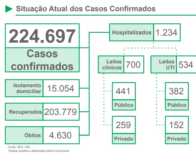 Foram recuperados 203.779 pacientes. A ocupação de leitos hospitalares nas cinco macrorregiões continua crítica. Na macrorregião de Campo Grande é de 103%; Dourados 95%; Três Lagoas 92%; Corumbá 92%.