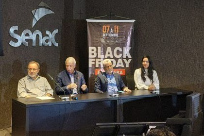 Foi lançada nesta terça-feira, 09 de agosto, em Campo Grande, a Black Friday Fronteira 2022, ação realizada pela ACEPP (Associação Comercial e Empresarial de Ponta Porã) e a Câmara de Comércio de Pedro Juan Caballero, com apoio da Fecomércio MS. A solenidade foi no Senac Turismo e Gastronomia e contou com a presença do presidente do Sistema Comércio, Sesc, Senac e IPF-MS, Edison Araújo; do presidente da Câmara de Indústria, Comércio Turismo y Servicio de PJC, Khalil Mansour El Haje e da Presidente da Associação Comercial e Empresarial de Ponta Porã, Fabricia Dias Prioste de Freitas, além do diretor-superintendente em exercício do Sebrae, Tito Estanqueiro.