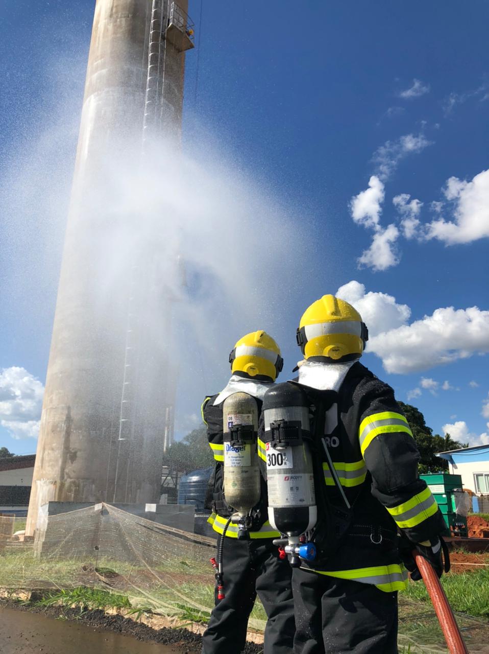 A ocorrência do simulado teve como origem um princípio de incêndio no posto de abastecimento de aeronaves, com salvamento de vítima de local elevado.