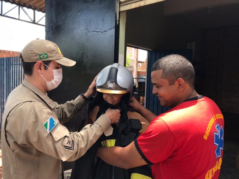 Durante a visita, o garoto também vestiu a roupa de combate a incêndio e teve contato com a viatura dos bombeiros militares.