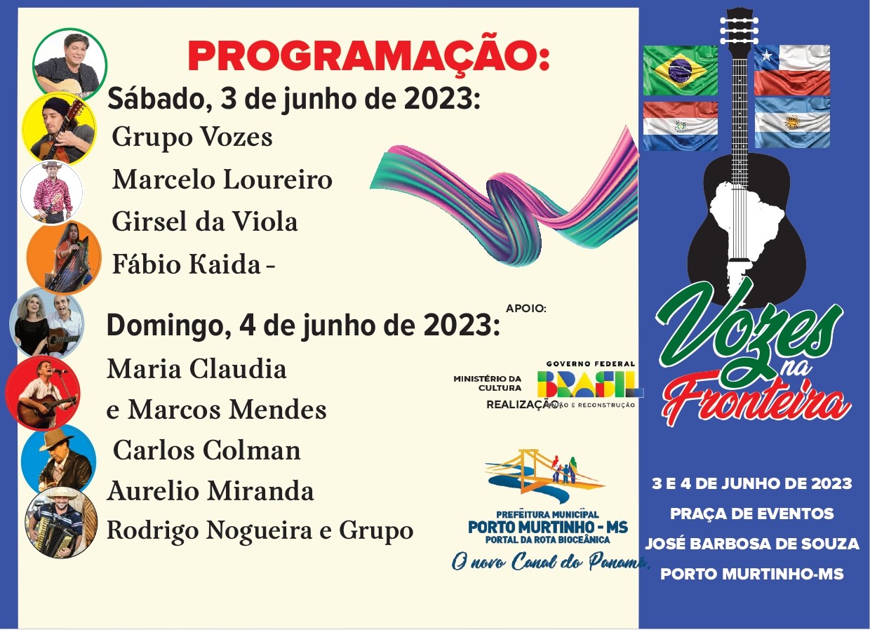Porto Murtinho, no extremo oeste da fronteira com o Paraguai, reúne nos dias 3 e 4 de junho consagrados interpretes da música regional para reverenciar a diversidade cultural de Mato Grosso do Sul e a festejada Rota Bioceânica, corredor que unirá os oceanos Atlântico e Pacífico. A primeira edição do Vozes na Fronteira será realizada na Praça de Eventos da cidade, com entrada franca, e faz parte da programação de aniversário da cidade, no dia 13 de junho.
