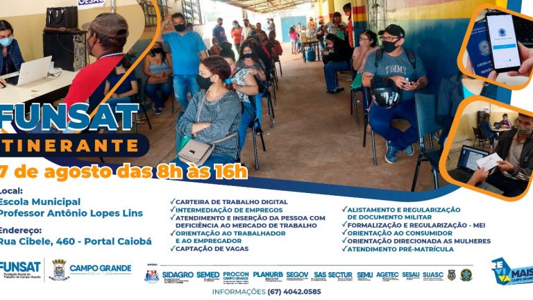 No mês de aniversário da Capital, a Prefeitura de Campo Grande, por intermédio da Fundação Social do Trabalho (Funsat) e secretarias parceiras, presenteia os moradores da região do Portal Caiobá com a 10° edição da ação Funsat Itinerante neste ano. O evento acontece no próximo sábado (7), das 08h às 16h, na Escola Municipal Professor Antônio Lopes Lins. A ação oferecerá diversos serviços à população.