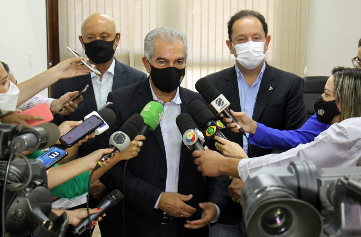 Carlos Alberto de Assis, diretor-presidente da Agems, órgão responsável pelo estudo que validou a redução, e p diretor-presidente da estatal, Walter Carneiro Junior, acompanharam o governador durante o anúncio.