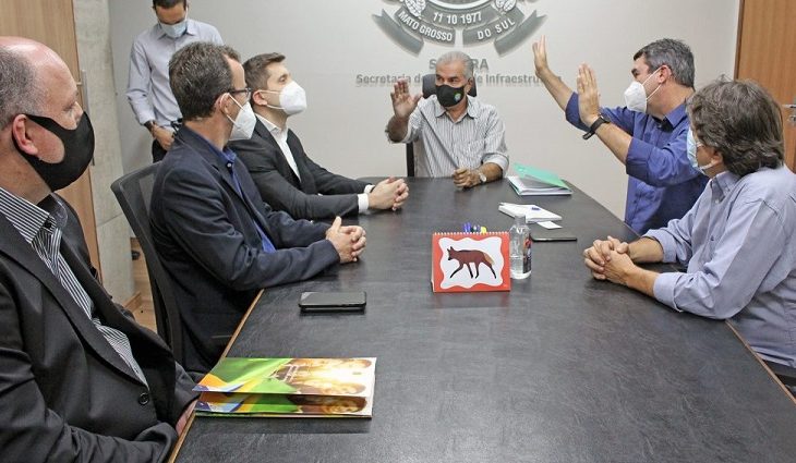 O governador Reinaldo Azambuja e o secretário de Infraestrutura, Eduardo Riedel, reuniram-se nesta quarta-feira (23) com representantes do Banco do Brasil para a assinatura do contrato de operação de crédito para investimentos na pavimentação de rodovias do Estado.