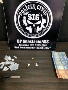 Anastácio (MS): No final da tarde de terça-feira (20), policiais civis do Setor de investigações Gerais da Delegacia de Polícia de Anastácio, em verificação a uma denúncia anônima de tráfico de drogas em uma chácara localizada nos altos da cidade, identificaram um usuário de 21 anos que confessou ter adquirido uma pequena porção de pasta base de cocaína (aproximadamente um uma grama) pelo valor de R$ 10,00, em local conhecido como “boca do curiango”.