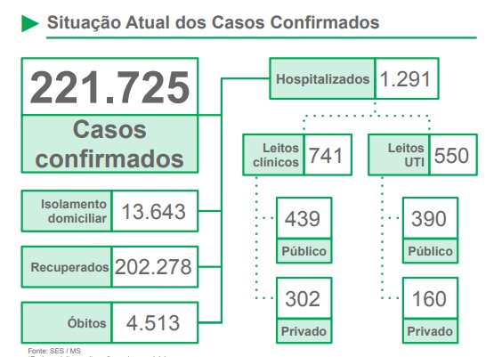 As cinco cidades com maior número de novos casos são: Campo Grande com mais 376; Dourados +139; Nova Andradina +48; Três Lagoas +39; Água Clara +30. Em virtude das medidas restritivas da semana passada, os números tiveram leve queda de 1,3.