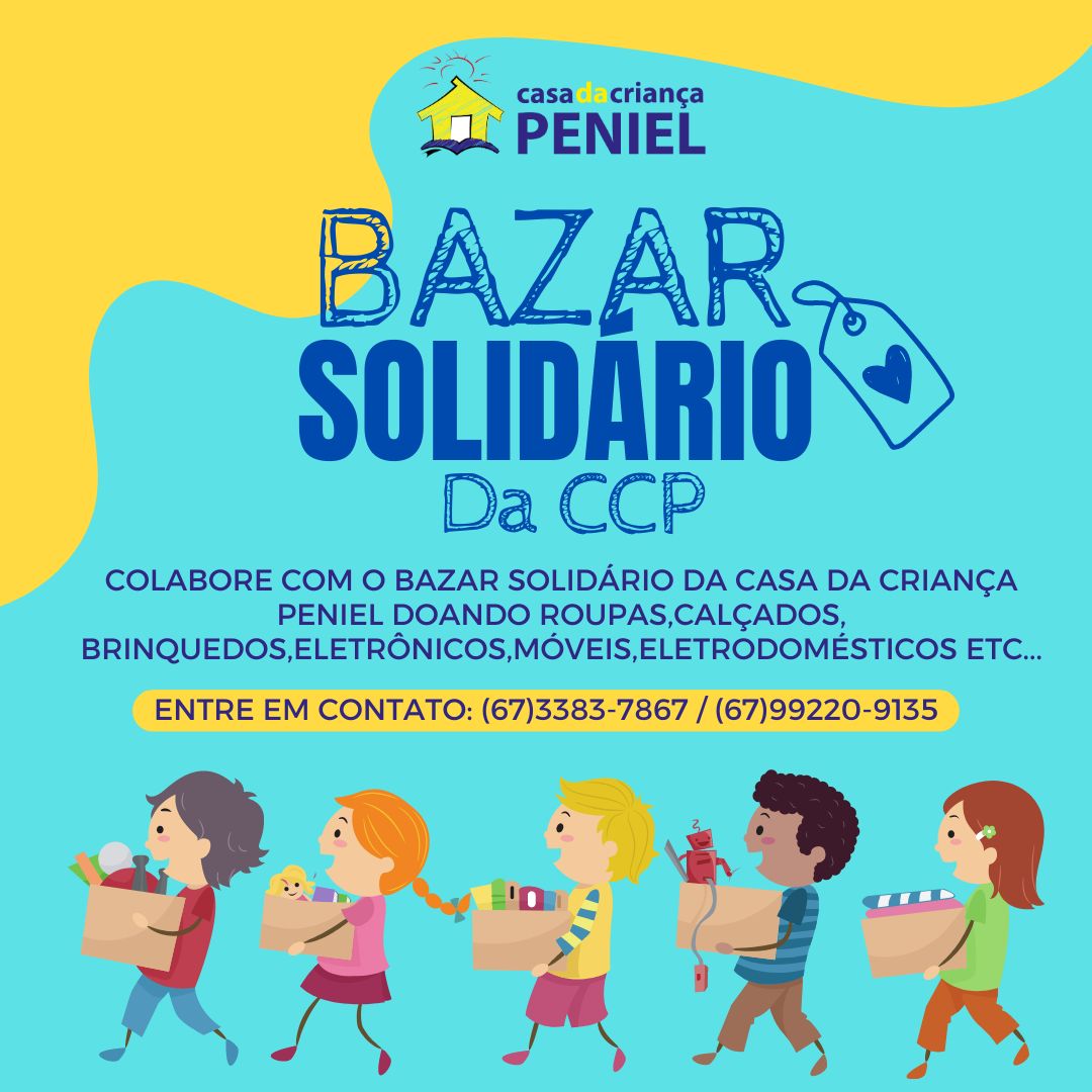 A Casa da Criança Peniel está realizando o tradicional Bazar em prol da instituição e para isso contamos mais uma vez com a sua solidariedade, que sempre tem doado peças em bom estado para compor o maravilhoso evento. A entidade está arrecadando roupas masculinas e femininas; acessórios; sapatos; móveis; eletrônicos; brinquedos; itens de cozinha; itens de decoração e etc.