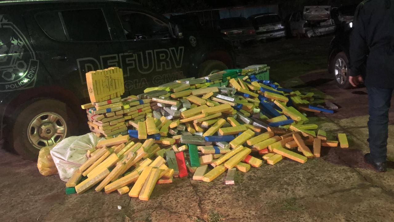 No interior do veículo Nissan Sentra foram apreendidos 965 quilos de maconha. Já na Delegacia, em checagem minuciosa, constatou através do chassi do veículo Nissan Sentra que constava cadastro de ocorrência de roubo e furto no Estado do Paraná.
