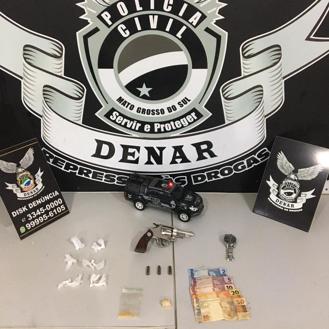 A prisão ocorreu durante trabalho de investigação oriundo da Operação Ômega, realizada em caráter permanente pela Delegacia Especializada, que culminou na apreensão de oito porções de pasta-base, divididas em papelotes e pedras, além de dinheiro trocado e um revólver calibre 32, com numeração raspada e 03 munições do mesmo calibre.