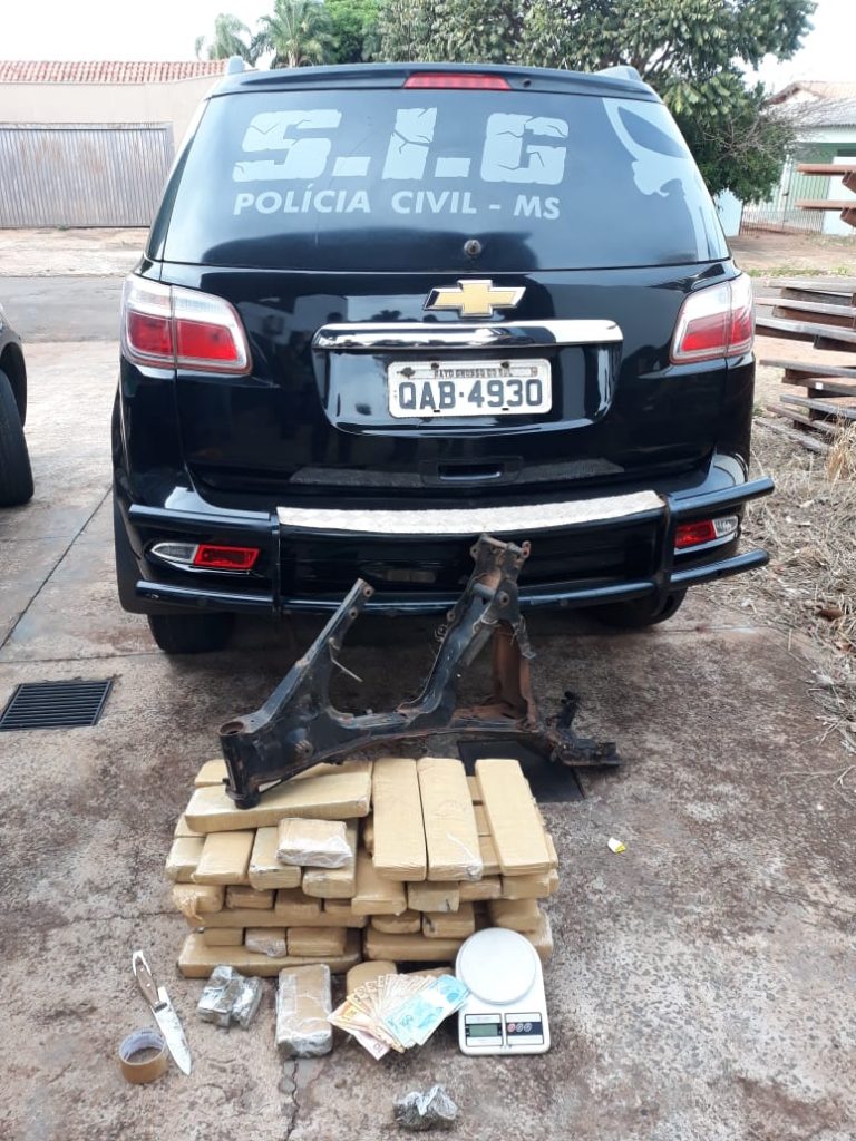 Havia também mandado de busca e apreensão no domicílio do suspeito e, após buscas no imóvel, foram localizados 51 tabletes de maconha, pesando 45kg, uma balança de precisão, R$1.900,00 em espécie. Também foi localizado um chassi de motocicleta com restrição de furto.