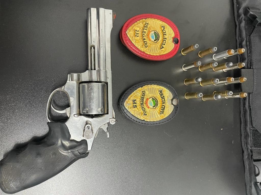 Diante dos fatos, a equipe policial civil de Miranda realizou diligencias até a Fazenda, constatando-se o fato e encontrando no local um revolver .357, municiado com 6 munições, bem como mais 10 munições intactas, além de diversas munições deflagradas num saco transparente.