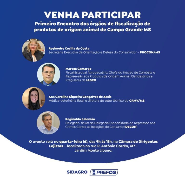 A Prefeitura de Campo Grande, por meio da Secretaria Municipal de Desenvolvimento Econômico Agronegócio (Sidagro) e da SIM Central MS, vai promover na próxima quarta-feira, 6 de setembro, o 1º encontro dos órgãos de fiscalização de produtos de origem animal de Campo Grande. O evento vai acontecer entre às 9h e 12h na Câmara de Dirigentes Lojistas – localizada na rua R. Antônio Corrêa, 417 – Jardim Monte Líbano.