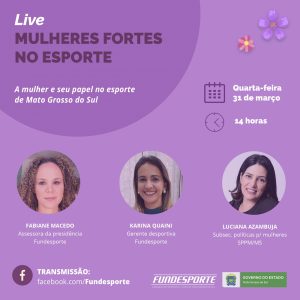 O evento on-line encerra a programação especial dedicada às mulheres neste mês de março, intitulada “Mulheres Fortes no Esporte”. A série de postagens nas redes sociais e site buscou homenagear, valorizar e destacar mulheres que fazem o desporto sul-mato-grossense acontecer: atletas, técnicas/treinadoras, gestoras e servidoras da Fundesporte.