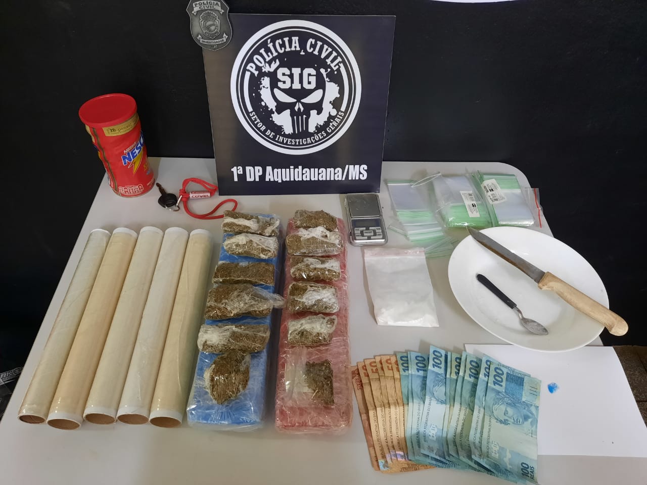 Aquidauana (MS): Policiais civis do Setor de Investigações Gerais da Primeira Delegacia de Polícia de Aquidauana, prenderam, em flagrante, um rapaz de 23 anos pelo crime de tráfico de drogas majorado por ser realizado próximo a estabelecimento de ensino. Após investigação e identificação do autor, os investigadores de polícia fizeram a abordagem ao suspeito quando este adentrava em uma oficina da cidade, nas imediações de uma Universidade.