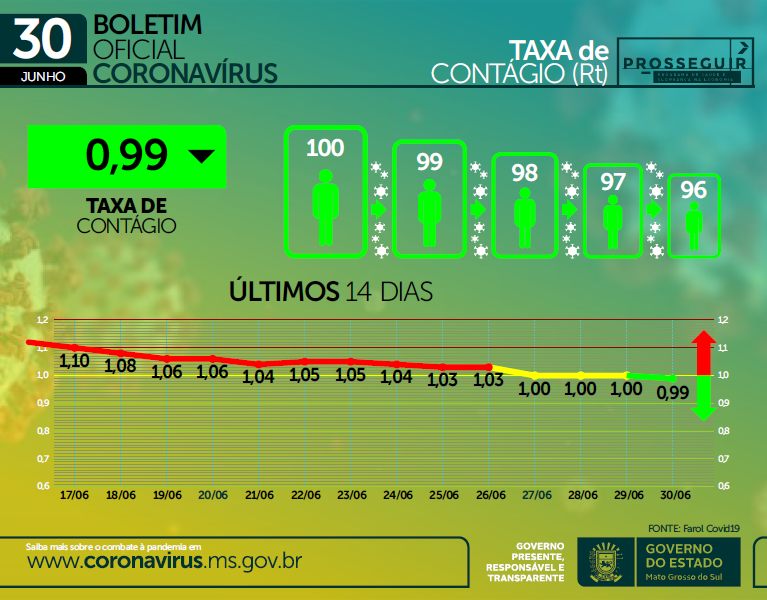 Após as medidas restritivas impostas pelo Governo do Estado e o avanço da vacinação, a taxa de contágio que no começo de junho já esteve em 1,14% em Mato Grosso do Sul, finalmente atingiu o patamar perseguido pela Secretaria de Estado de Saúde (SES) de 0,99%.