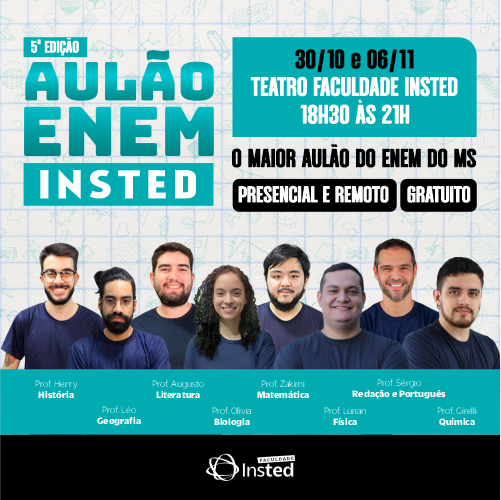 Nos dias 30 de outubro e 06 de novembro, das 18h30 às 21h, a Faculdade Insted realiza seu tradicional aulão preparatório para o Exame Nacional do Ensino Médio (Enem). Os interessados devem se cadastrar gratuitamente através do site https://insted.edu.br/, na aba “Eventos”. As aulas serão realizadas presencialmente no teatro da instituição com transmissão simultânea para quem optar por assisti-las de forma remota.