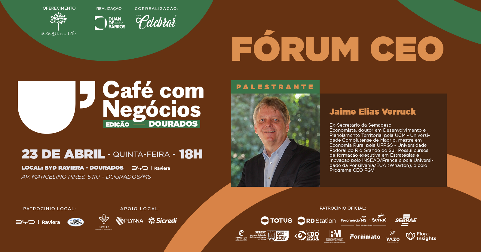 O Café com Negócios retorna a Dourados no dia 23 de abril com o Fórum CEO, evento que reunirá empresários, executivos e lideranças em um encontro de alto nível para debater desenvolvimento econômico, estratégias e oportunidades em Mato Grosso do Sul. O palestrante será o ex-secretário de Estado de Meio Ambiente, Desenvolvimento, Ciência, Tecnologia e Inovação (Semadesc), Jaime Elias Verruck. A programação começa às 18h, na BYD Dourados, com correalização da Revista Celebrar.